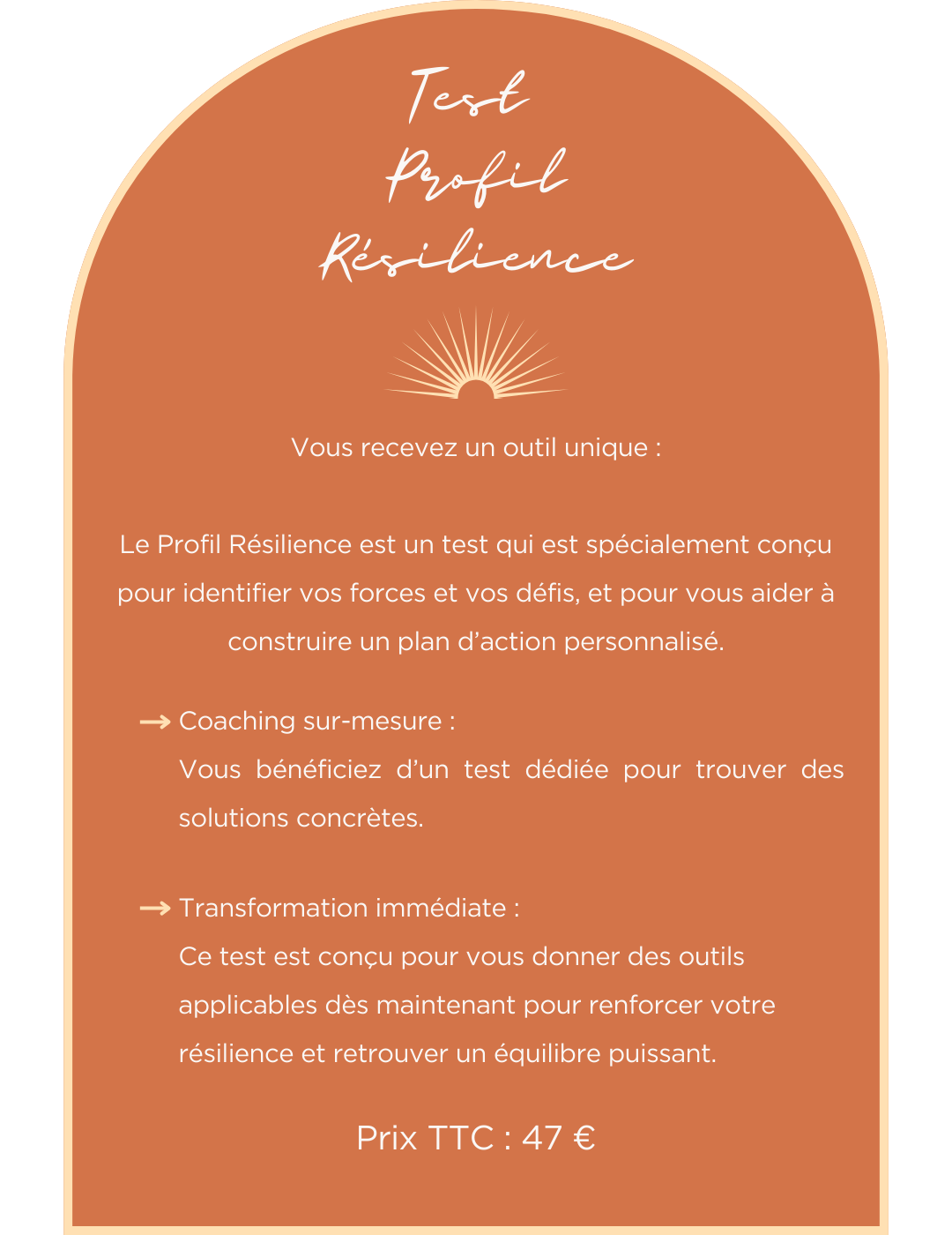 Le Profil Résilience est un test qui est spécialement conçu pour identifier vos forces et vos défis, et pour vous aider à construire un plan d’action personnalisé. Vous recevrez le lien pour effectuer votre test, juste après son achat.